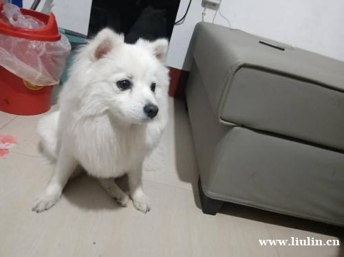 博美,名字叫小白,是条纯白色的狗狗,中犬